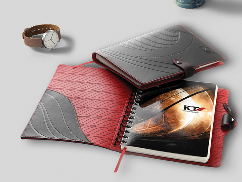 Nous avons créé un design de carnet qui s'identifie parfaitement aux produits de KT International. En plaçant les feuilles de tabac présentes dans le logo sur la couverture, nous avons produit un carnet personnalisé pour la marque. En combinant notre modèle Flexi avec le carnet à spirale et le système à bouton-pression souhaités par notre client, nous avons créé un carnet extrêmement unique, jamais réalisé auparavant. Cette approche innovante a donné naissance à un produit distinctif reflétant parfaitement l'identité de KT International.