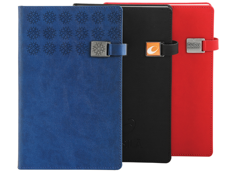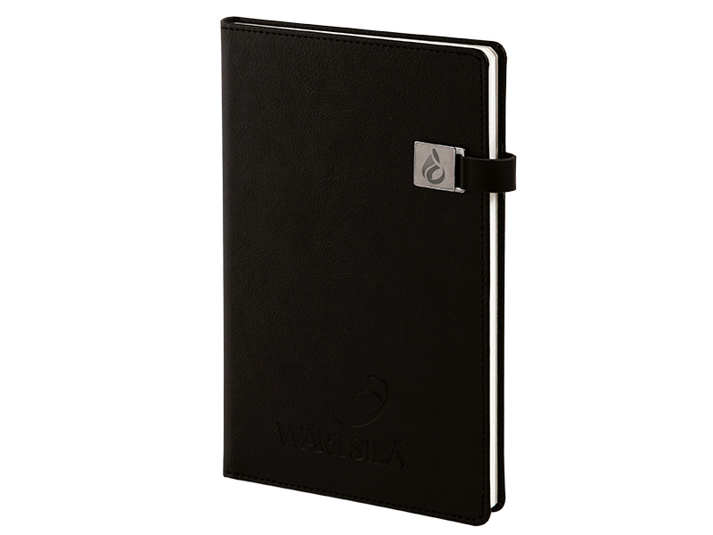 Souhaitez-vous voir votre marque sur la couverture du carnet, tel un bijou ? De plus, vous n'êtes pas limité à un simple logo en métal coulé. Jetez un œil à nos autres options. Un clip magnétique, avec votre logo, remplaçant l'élastique de fermeture, élève l'agenda et le carnet au-delà des cadeaux d'entreprise classiques.