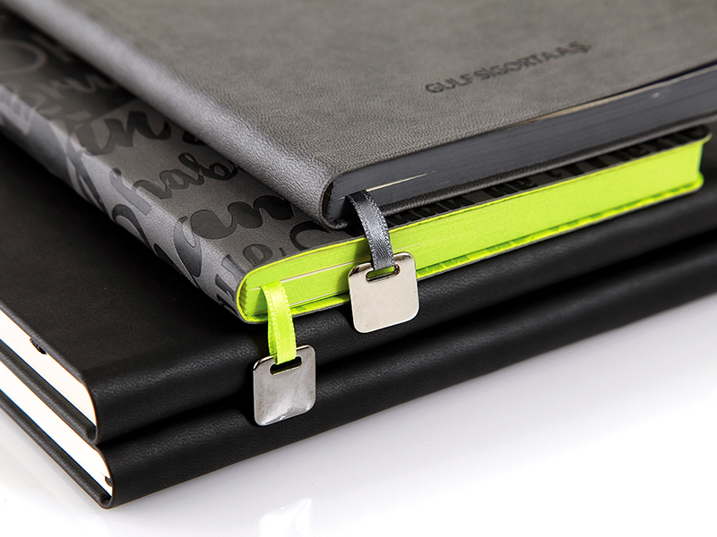 Un métal personnalisé avec votre logo, fixé aux extrémités des rubans des agendas et des carnets, transforme le carnet en un produit élégant. Vous pouvez l'orner d'une pièce métallique exclusive à votre marque, ajoutée au bout du ruban (qui est l'une des pièces essentielles du carnet en termes de fonctionnalité), en accord avec la couleur du ruban.